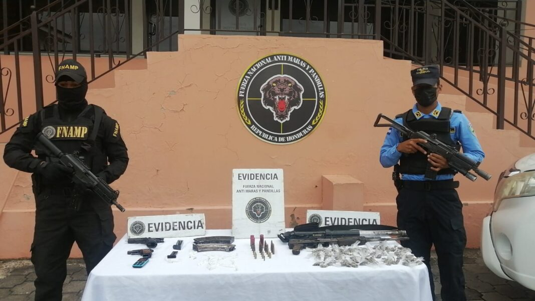 Funcionarios de la Fuerza Nacional Antimaras y Pandillas (FNAMP), ubicó y decomisó armas que pueden estar vínculadas en otros hechos criminales, drogas y teléfonos celulares del Grupo Delictivo Organizado MS-13, en la capital hondureña.