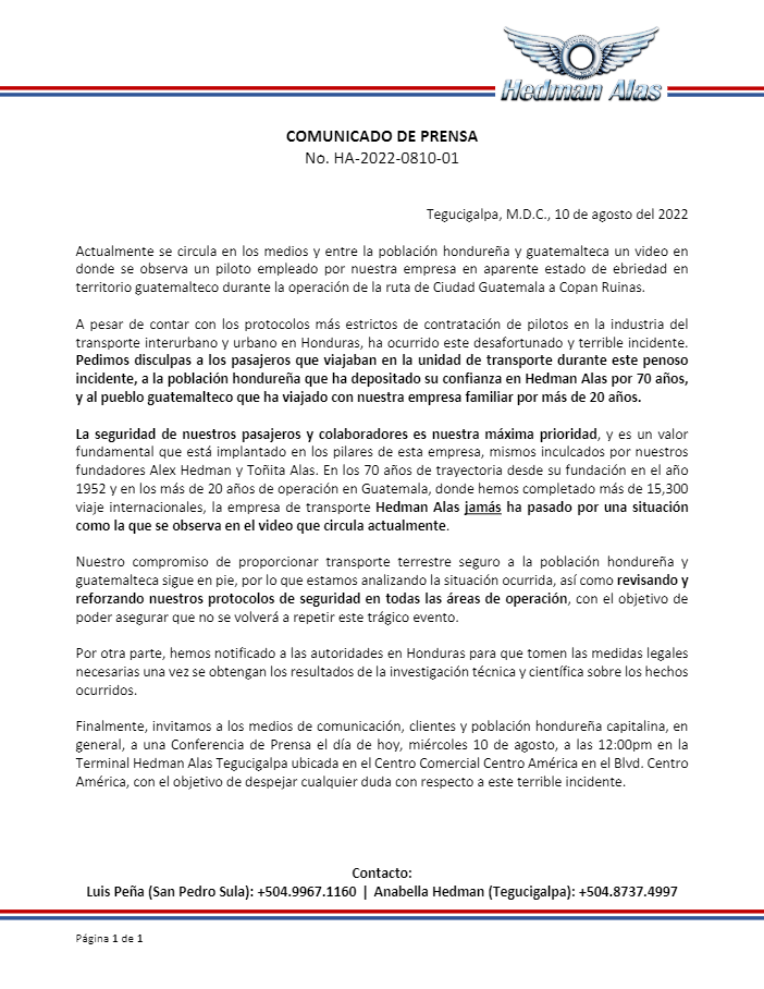 En el comunicado entregado a Proceso Digital, se describe que, actualmente se circula en los medios y entre la población hondureña y guatemalteca un video en donde se observa un piloto empleado por nuestra empresa en aparente estado de ebriedad en territorio guatemalteco durante la operación de la ruta de Ciudad Guatemala a Copán Ruinas, informa la empresa en el comunicado.