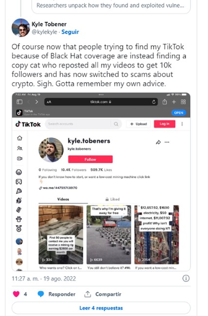 3. Cuentas de bots en TikTok: Todavía existen muchas cuentas de TikTok que son bots programados para interactuar con usuarios específicos y con la intención de hacerles creer que se están comunicando con una persona real. En última instancia, estos bots pueden pedir a las víctimas información confidencial o incluso sugerir que las víctimas sean redirigidas a un sitio que, de hecho, es un sitio fraudulento que intenta robarles información o instalar malware en sus teléfonos.
