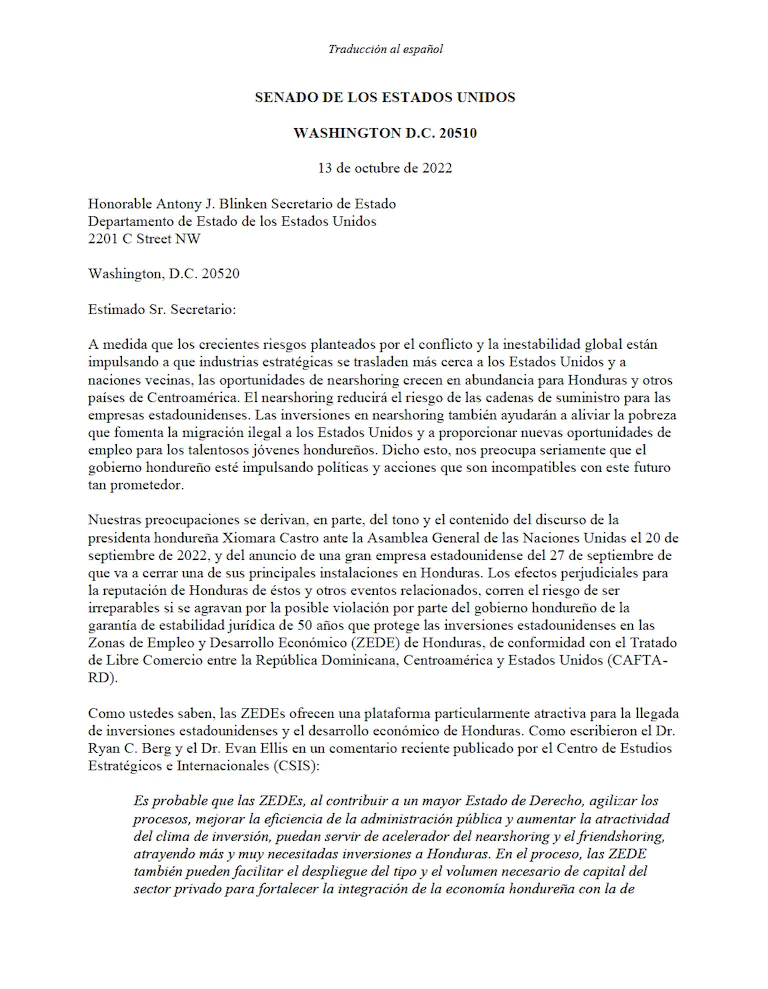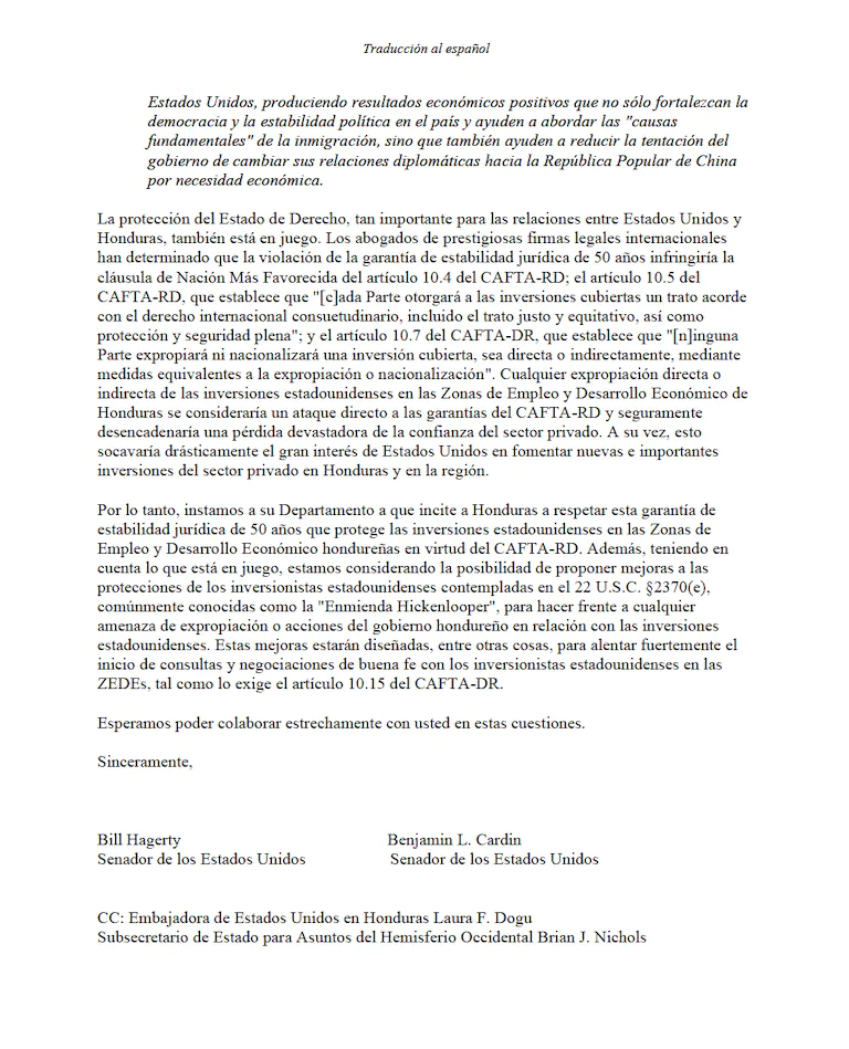 Los senadores Cardin y Hagerty, ambos miembros del Comité de Relaciones Exteriores del Senado, resaltaron que si no se respeta el Estado de Derecho en lo que respecta a la inversión estadounidense en las Zonas de Empleo y Desarrollo Económico (ZEDE) de Honduras, se podrían poner en peligro las enormes oportunidades de crecimiento económico y de empleo en el país. Miles de millones de dólares de inversión privada en Honduras, y la propia Alianza para Centroamérica, corren el riesgo inminente de quedar al margen si no se respeta la garantía de estabilidad jurídica de 50 años que protege la inversión estadounidense en las ZEDE. Por el contrario, honrar el derecho internacional y los acuerdos de estabilidad jurídica con inversores estadounidenses como Honduras Próspera Inc. (el promotor y organizador de Próspera ZEDE, con base en Estados Unidos) envía un mensaje fuerte y estable a la comunidad de inversores; y promete ser un beneficio para los miles de hondureños actualmente empleados en Próspera y otras ZEDEs.