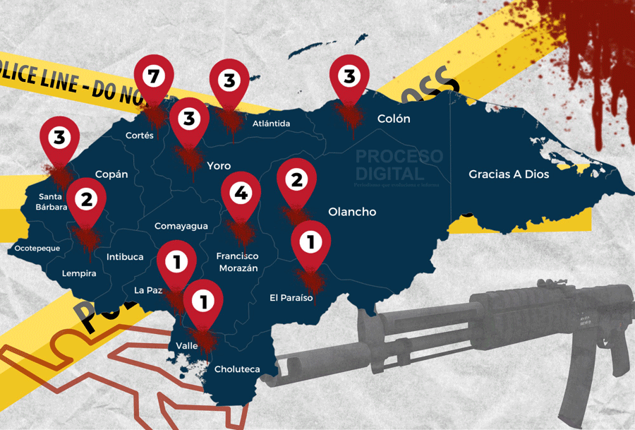 Cuatro municipios del departamento de Yoro fueron escenario de igual número de matanzas que dejaron como saldo, al menos, 16 muertos; de igual manera, en 4 municipios de Santa Bárbara se registraron igual número de matanzas que dejaron otros 16 muertos.