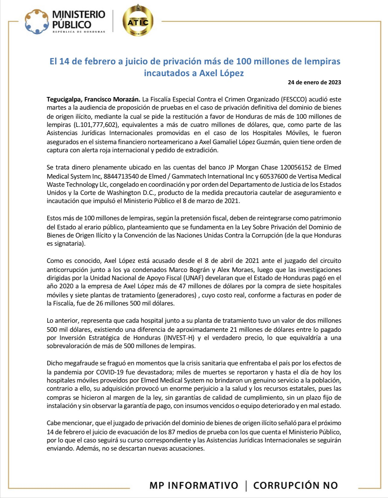 Como es conocido, Axel López está acusado desde el 8 de abril de 2021 ante el juzgado del circuito anticorrupción junto a los ya condenados Marco Bográn y Alex Moraes, luego que las investigaciones dirigidas por la Unidad Nacional de Apoyo Fiscal (UNAF) develaran que el Estado de Honduras pagó en el año 2020 a la empresa de Axel López más de 47 millones de dólares por la compra de siete hospitales móviles y siete plantas de tratamiento (generadores) , cuyo costo real, conforme a facturas en poder de la Fiscalía, fue de 26 millones 500 mil dólares.