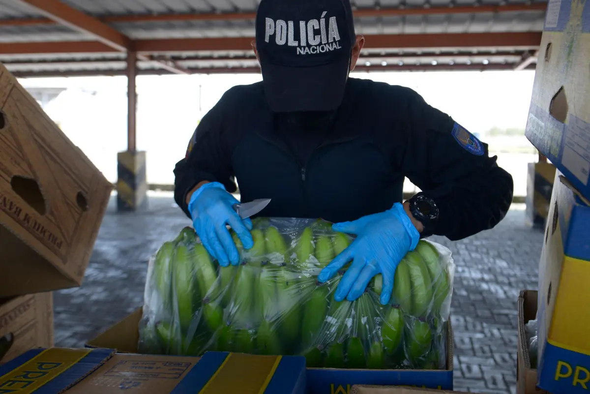 El decomiso se hizo al inspeccionar el contenedor en la portuaria ciudad de Guayaquil, donde los agentes policiales encontraron 23 sacos escondidos entre las cajas de fruta, en cuyo interior había 1.145 paquetes rectangulares de cocaína con un peso en conjunto de 1.133 kilos.