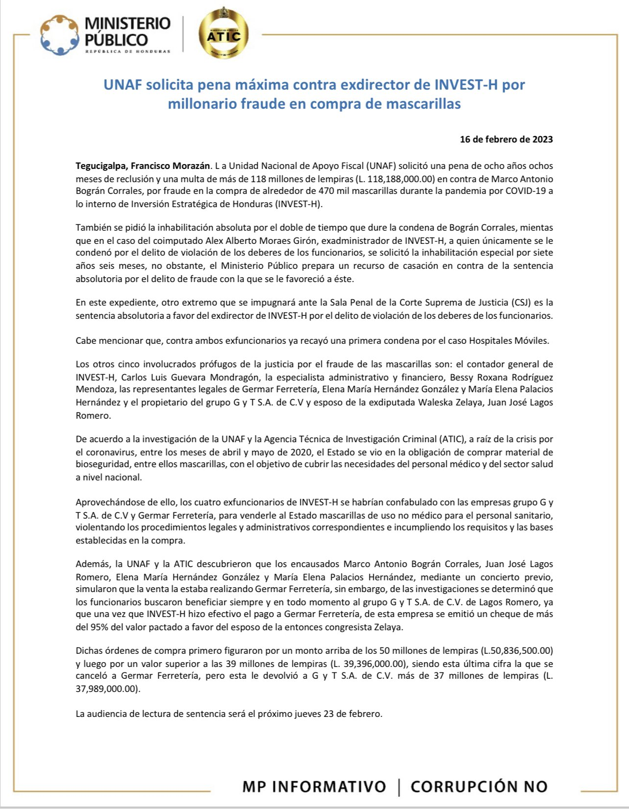 La Unidad Nacional de Apoyo Fiscal (UNAF) solicitó una pena de ocho años ochos meses de reclusión y una multa de más de 118 millones de lempiras (L. 118,188,000.00) en contra de Marco Antonio Bográn Corrales, por fraude en la compra de alrededor de 470 mil mascarillas durante la pandemia por COVID-19 a lo interno de Inversión Estratégica de Honduras (INVEST-H).