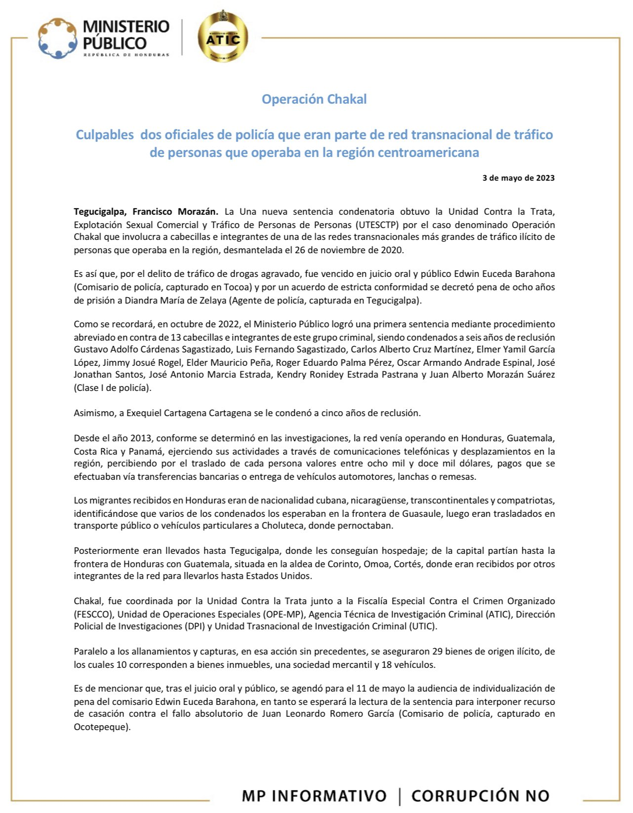 Es de mencionar que, tras el juicio oral y público, se agendó para el 11 de mayo la audiencia de individualización de pena del comisario Edwin Euceda Barahona, en tanto se esperará la lectura de la sentencia para interponer recurso de casación contra el fallo absolutorio de Juan Leonardo Romero García (Comisario de policía, capturado en Ocotepeque).