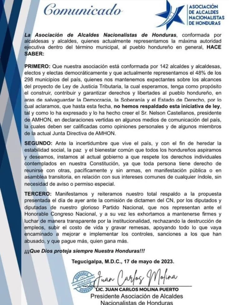 La Asociación de Alcaldes Nacionalistas de Honduras, negaron mediante un comunicado que estén respaldado la iniciativa de Ley Tributaria, tal y como lo ha expresado el presidente de la Asociación de Municipios de Honduras (Amhon), Nelson Castellanos.