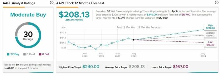 Según Tipranks, Apple cuenta con 30 revisiones de analistas divididas en 22 compras y 8 mantener. El precio objetivo promedio es de 208.13 dólares con un pronóstico alto de 240 dólares  y un pronóstico bajo de 167 dólares. El precio objetivo promedio representa un cambio del 19.61% con respecto al cierre del jueves.