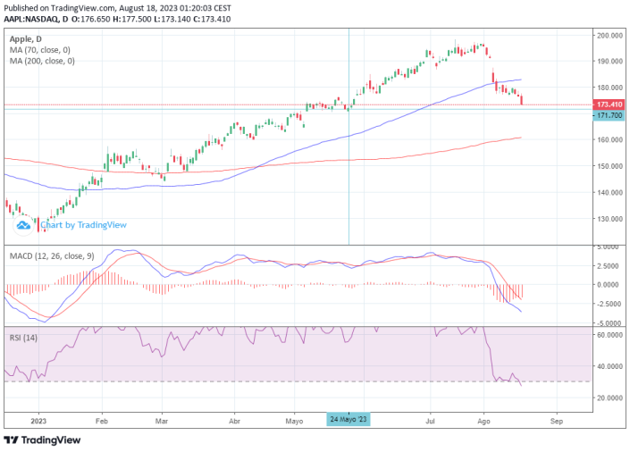 Apple cerraba el jueves a la baja en los 173,34 dólares en rojo. La media móvil 70 periodos se mantiene por encima de las últimas velas, RSI debajo del nivel de sobre venta y las líneas del MACD se mantienen debajo del nivel de cero.