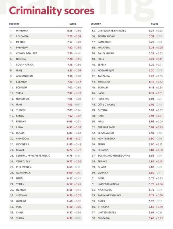 En el informe del ente se destaca en el primer lugar a Myanmar con 8.15%, seguido por Colombia 7.75%, México 7.57%, Paraguay 7.52%, Congo 7.35%, Nigeria 7.28%, Sudáfrica 7.18%, Iraq 7.13%, Afganistán 7.10% y Líbano 7.10%.
