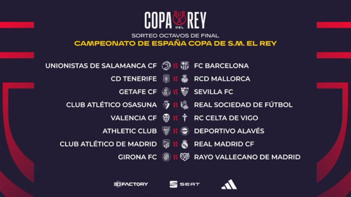Unionistas de Salamanca-Barcelona y Atlético de Madrid-Real Madrid son dos de los emparejamientos de octavos de final de la Copa del Rey, según deparó el sorteo celebrado el lunes en la Ciudad del Fútbol de Las Rozas.