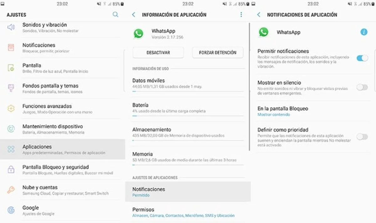 Es necesario revisar que WhatsApp tenga permiso para mostrar notificaciones emergentes. Para esto, se accede a “Ajustes” en el dispositivo, se selecciona “Aplicaciones”, luego WhatsApp y finalmente “Notificaciones”, asegurándose de que los permisos estén activados.
