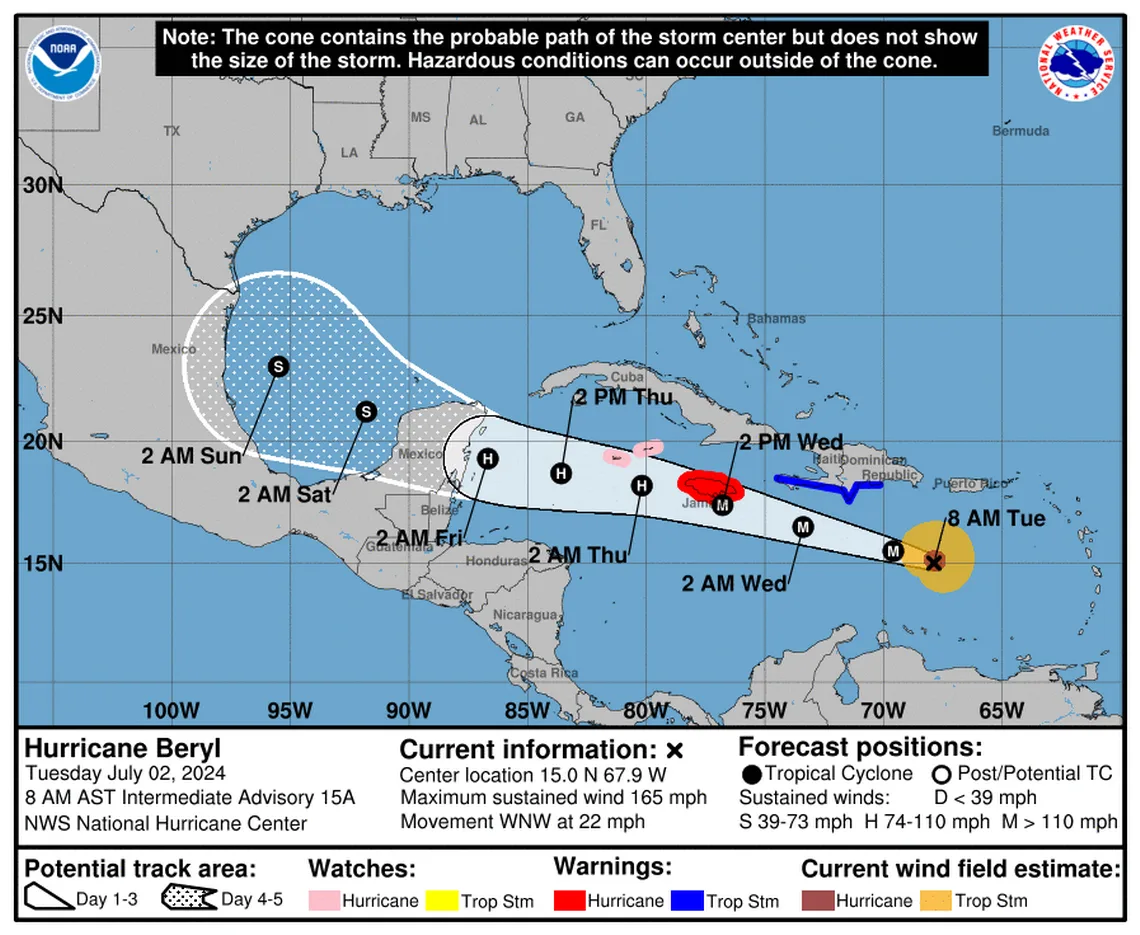 Debido al potencial de Beryl de girar más hacia el noroeste al llegar al noroeste del Caribe, los intereses en Estados Unidos, especialmente en la costa de Texas, deberían monitorear de cerca el progreso del huracán y los pronósticos de los meteorólogos.