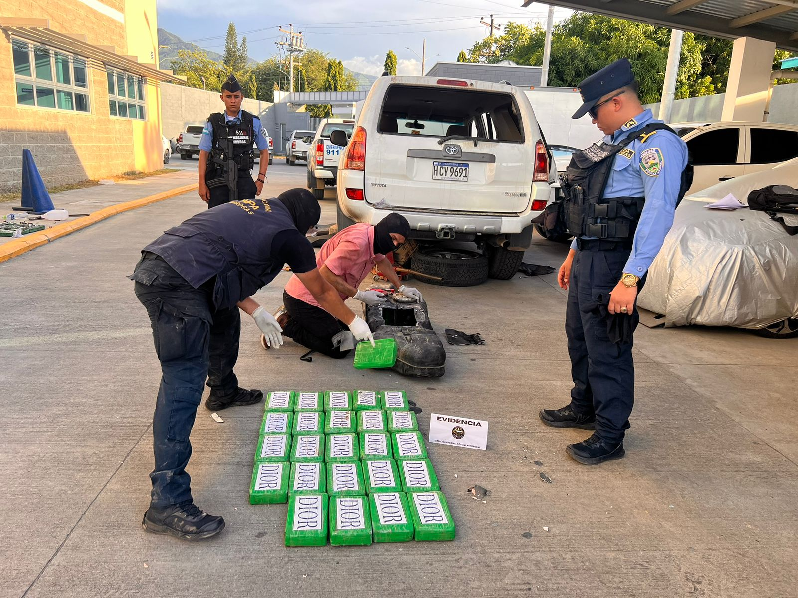 La acción estuvo a cargo de la Dirección Nacional Policial Antidrogas (DNPA) quienes requirieron dos vehículos tipo camionetas, marca Toyota, modelo 4Runner con matrículas HDQ 7371 y HCY 9691, respectivamente, mismos que fueron objeto de inspección encontrándose en compartimientos falsos los 64 paquetes de la droga.
