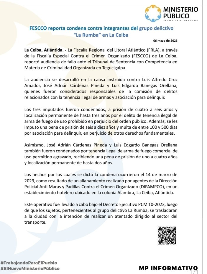 FESCCO reporta condena contra integrantes del grupo delictivo “La Rumba” en La Ceiba